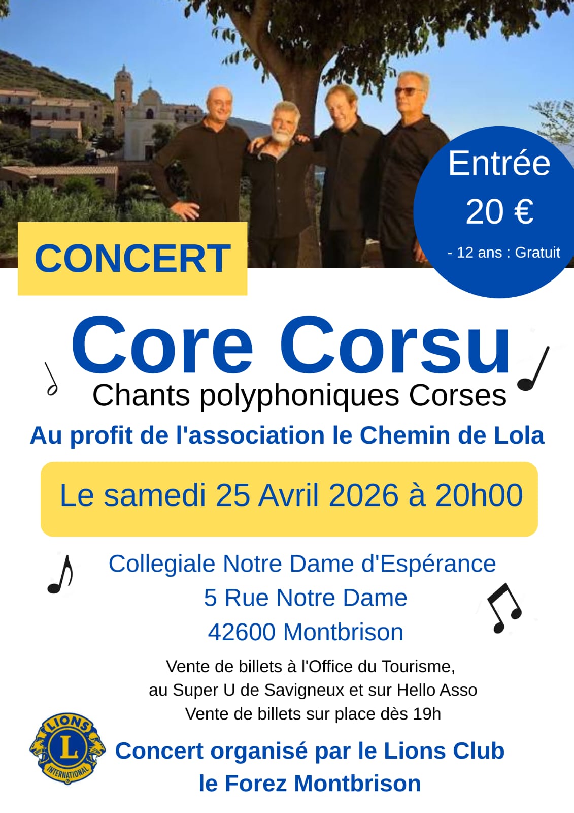 Publié le 5 janvier 202513 mars 2026 par bernardle samedi 25 avril 2026, en la collégiale de MONTBRISON (42) le samedi 25 avril 2026, à 20h00, en la collégiale Notre Dame d’Espérance de MONTBRISON, CORE CORSU donnera un concert de polyphonies et chants de la montagne et des villages de l’île de beauté.